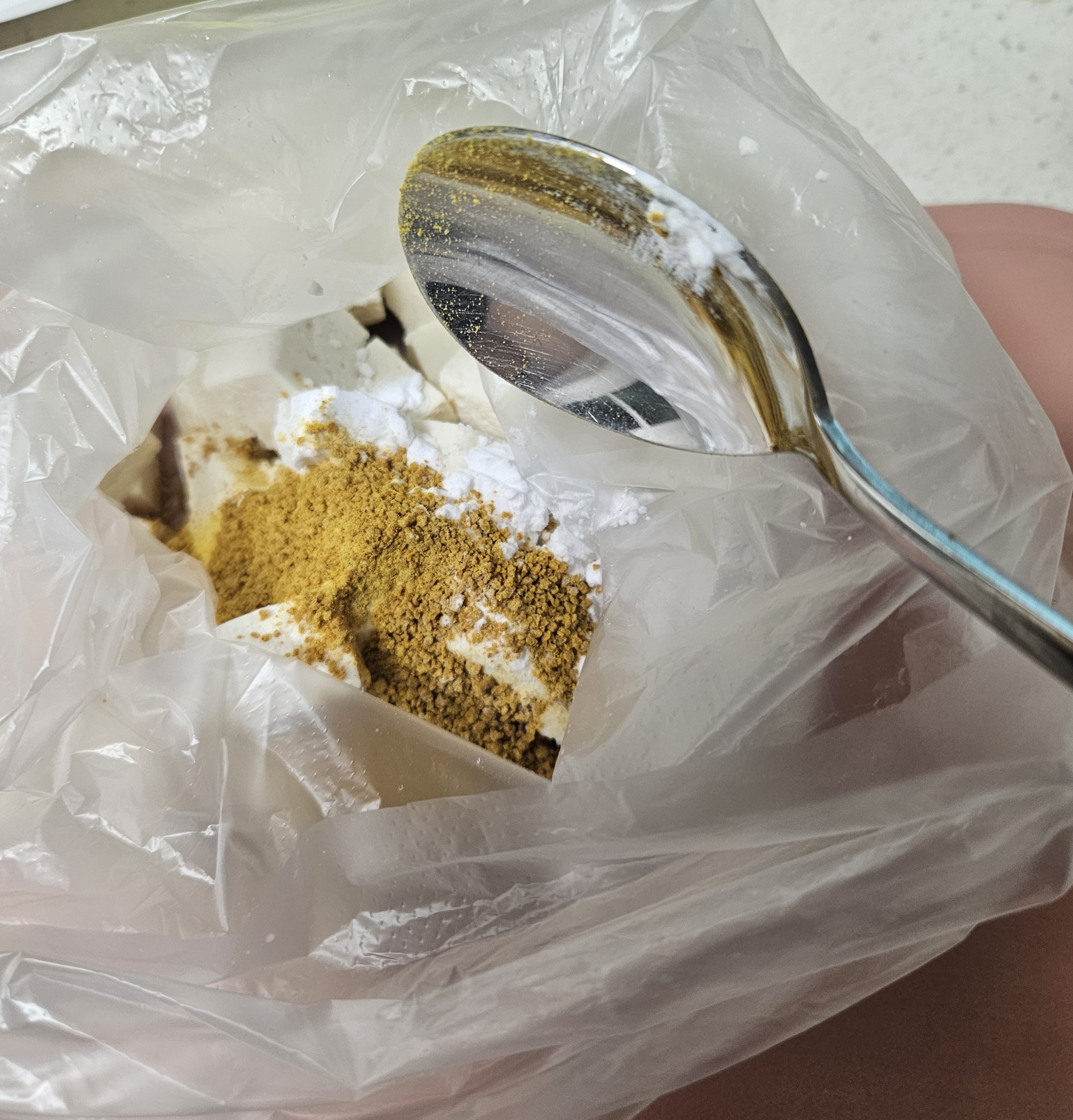 ▼그다음 전분가루 2스푼, 카레가루 2스푼, 소금 및 후추 한 꼬집 넣은 후 봉지채 흔들어주세요.