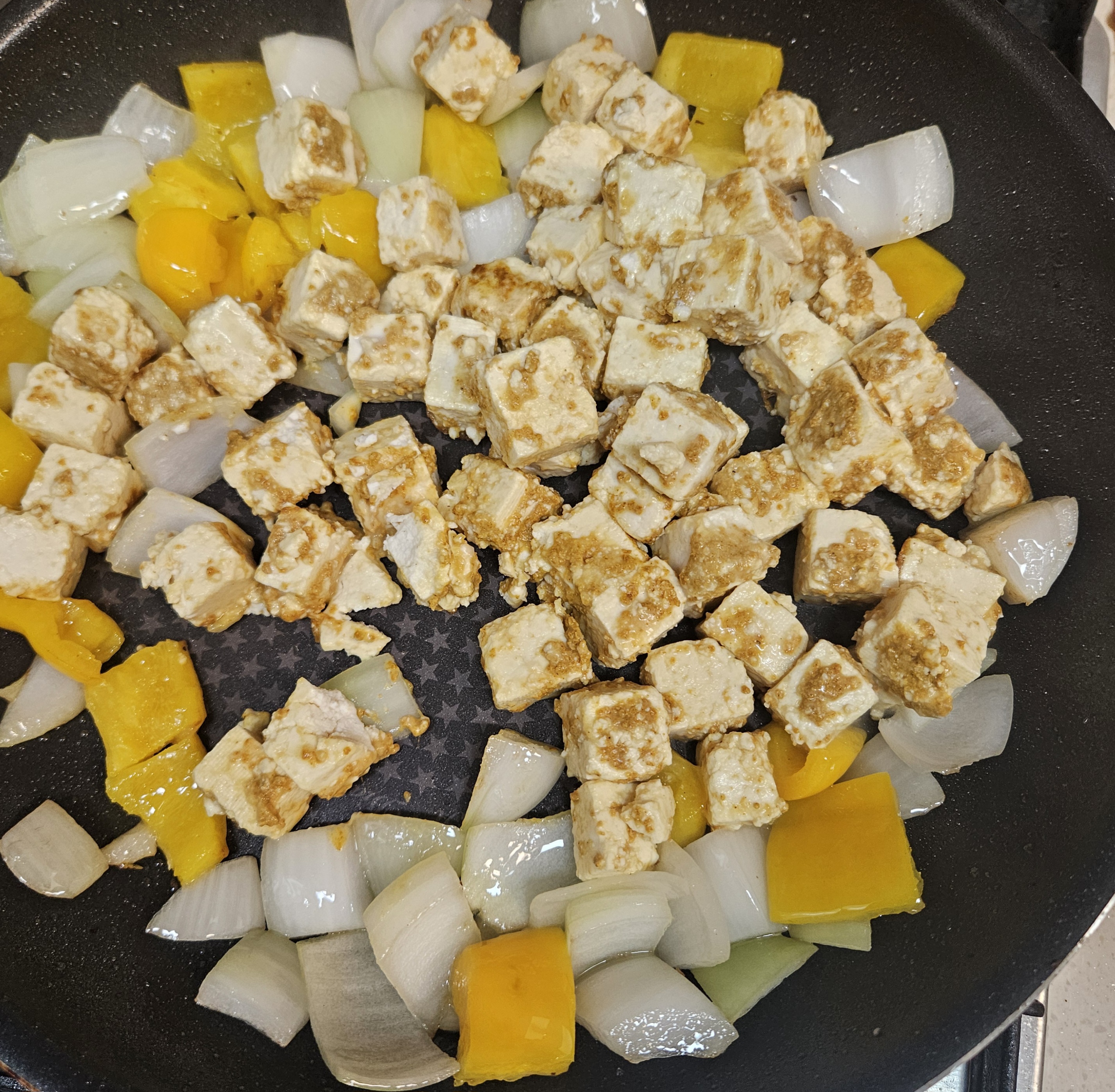 ▼양파가 노릇하게 익었다 싶으면 두부를 넣어줍니다.