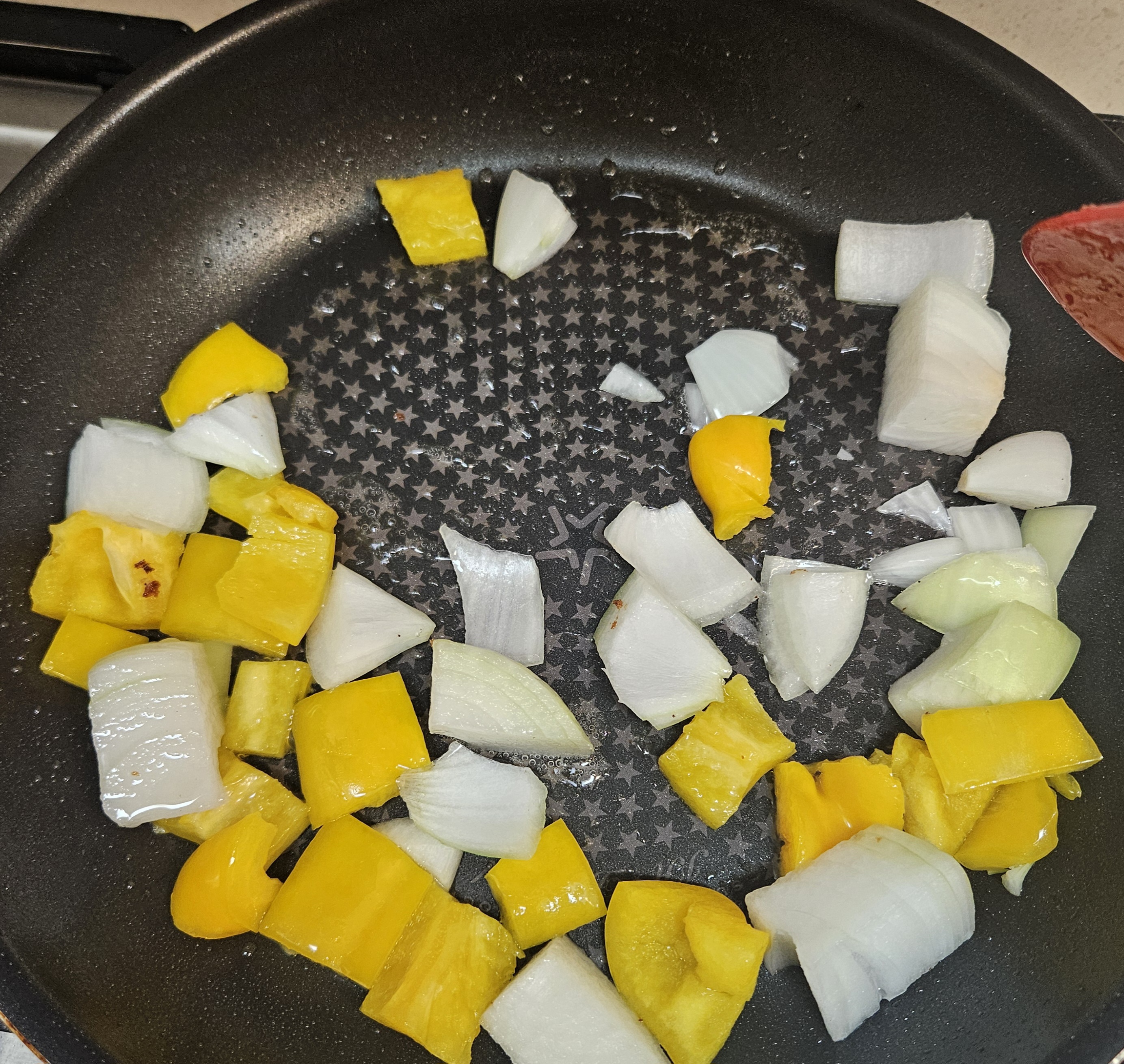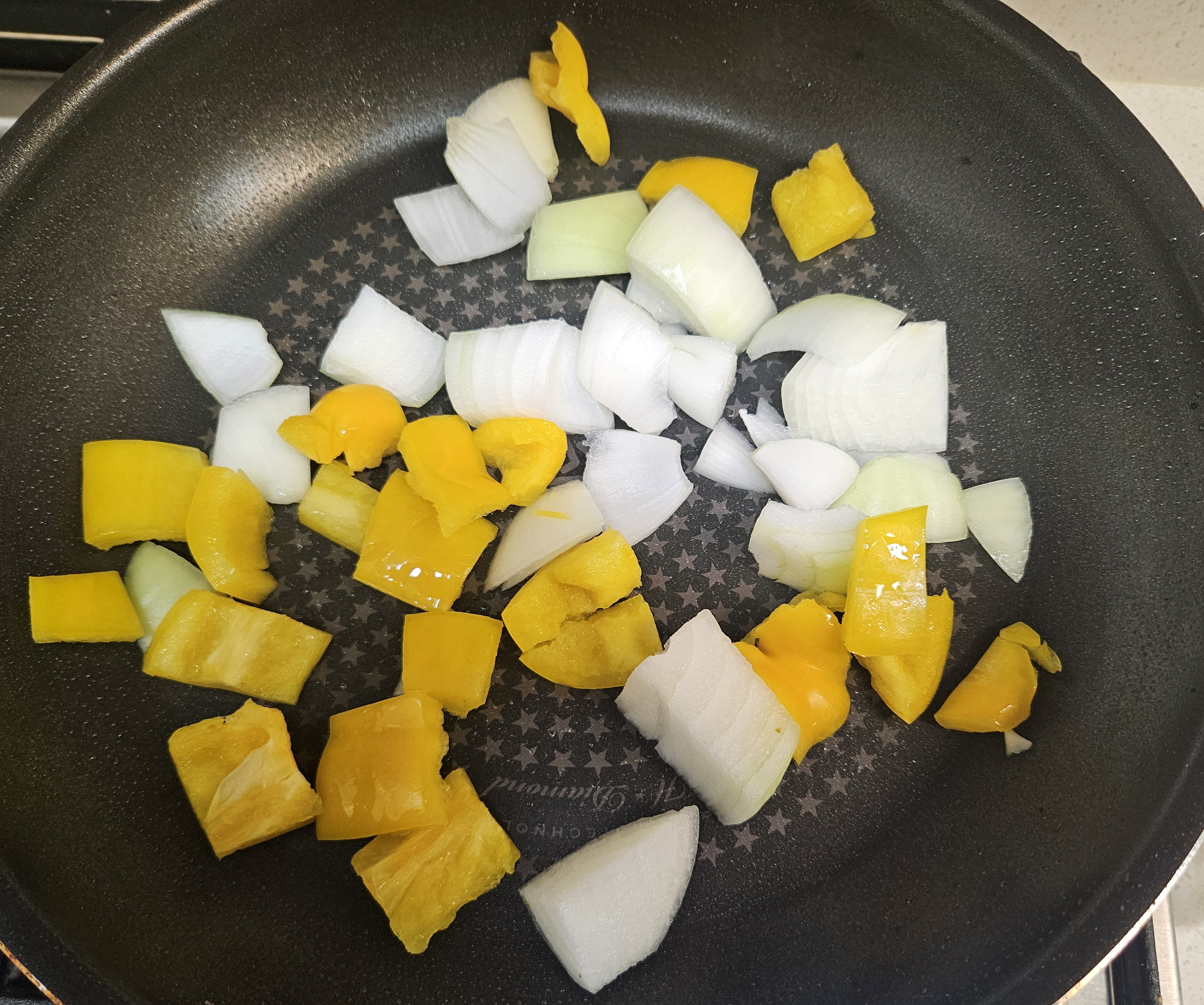 ▼프라이팬에 기름을 두른 뒤 양파, 파프리카를 먼저 볶아줍니다.