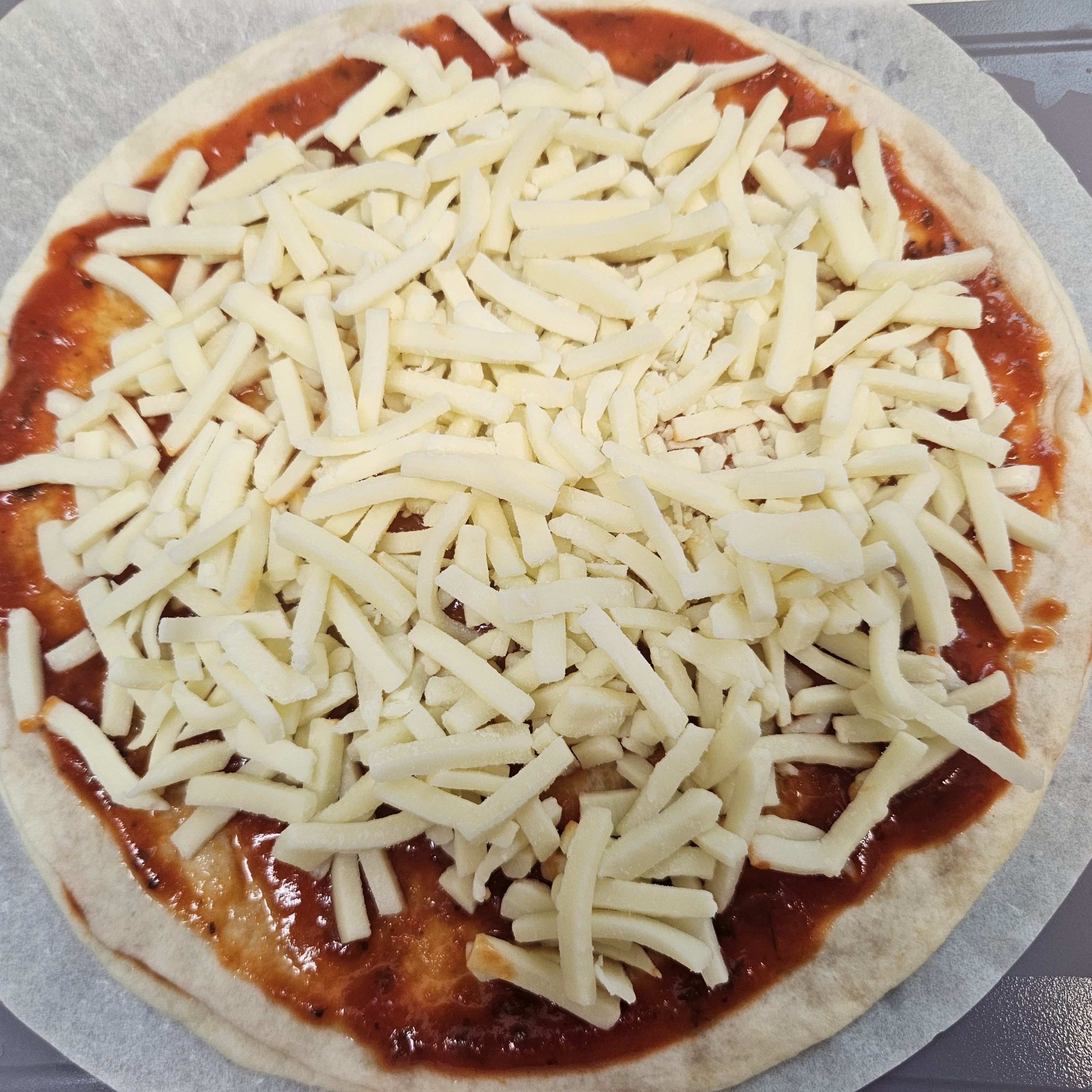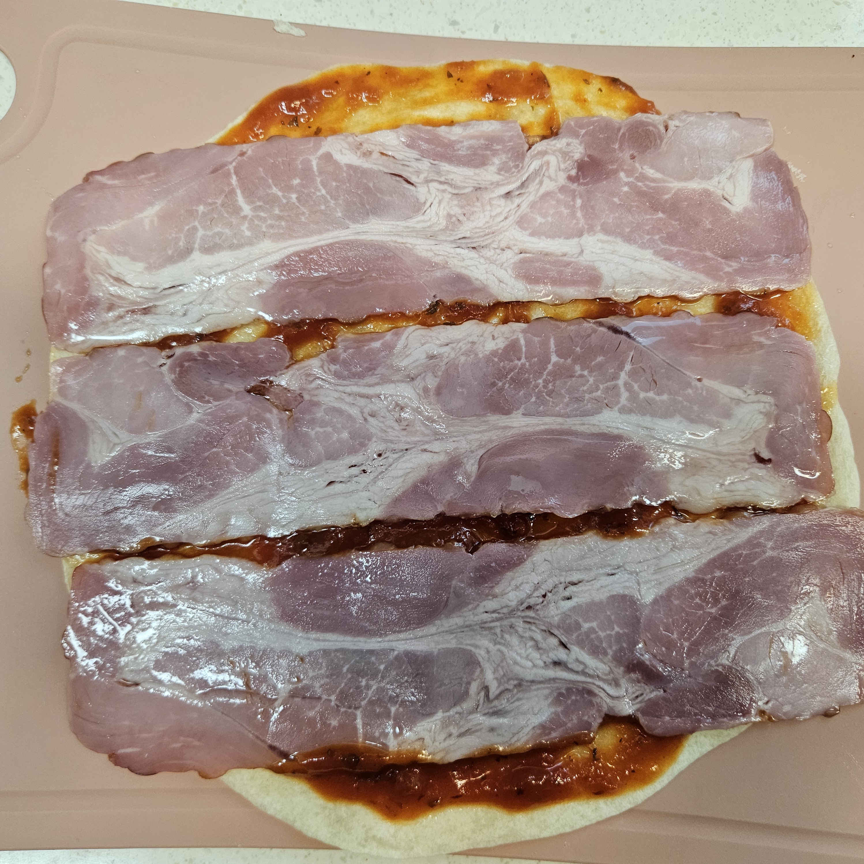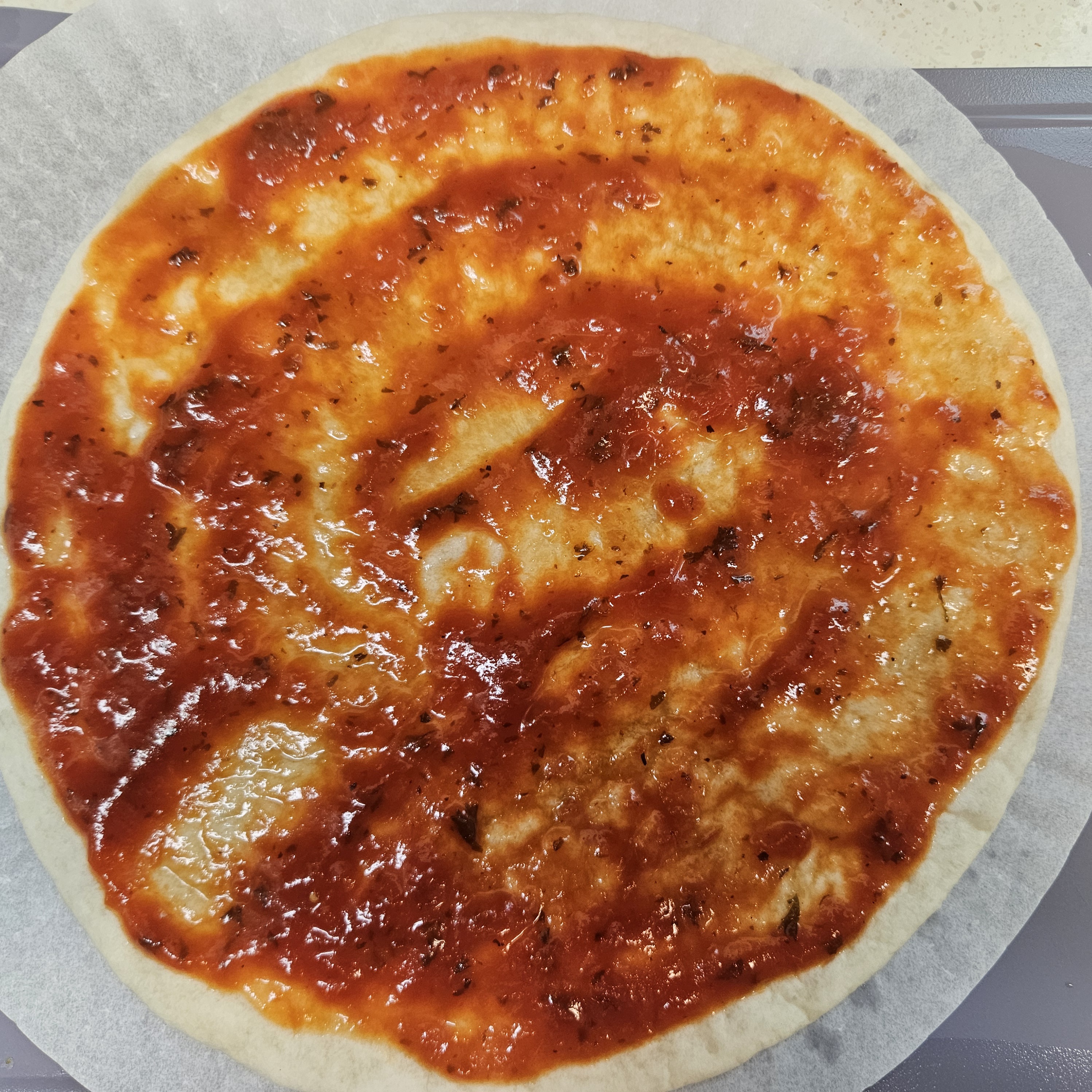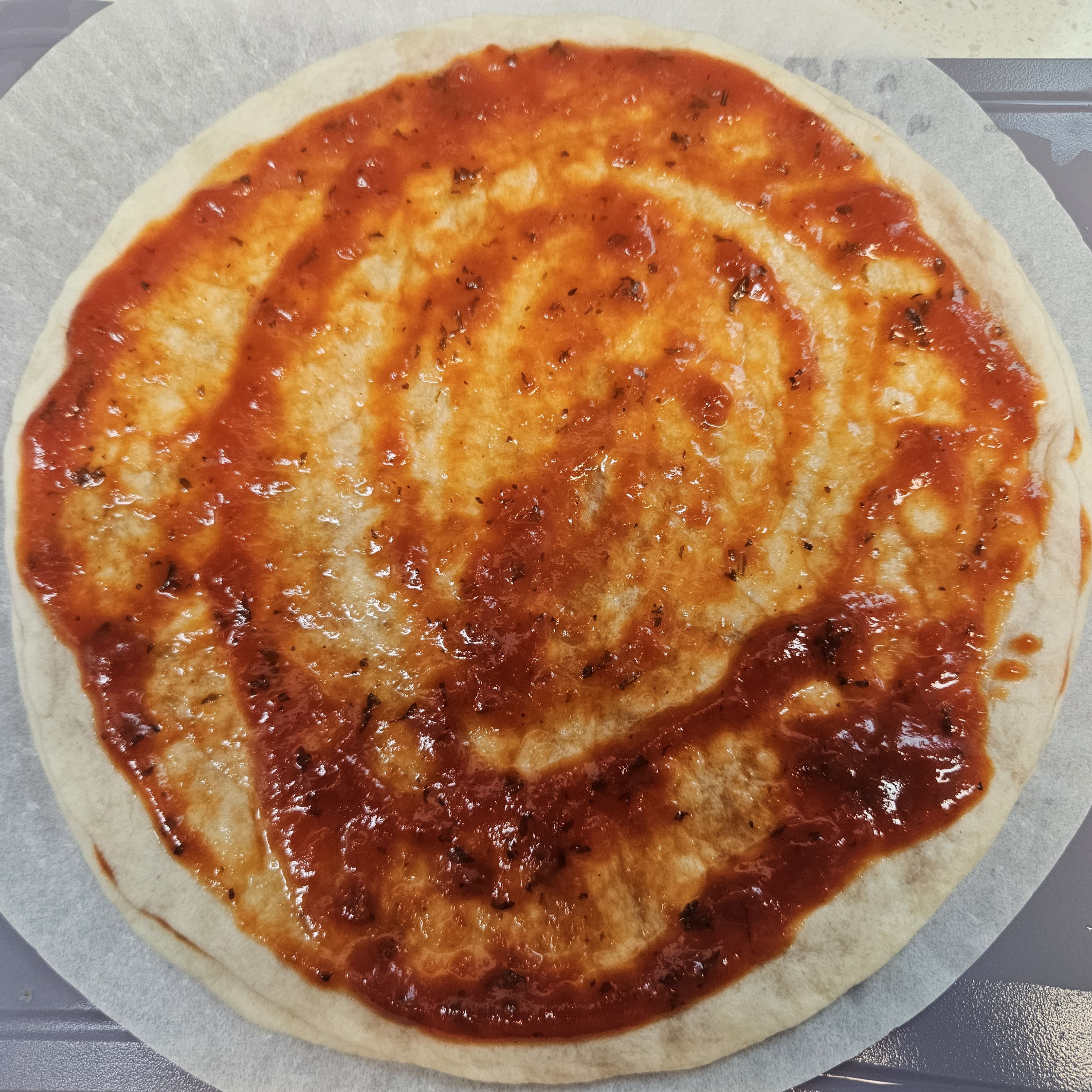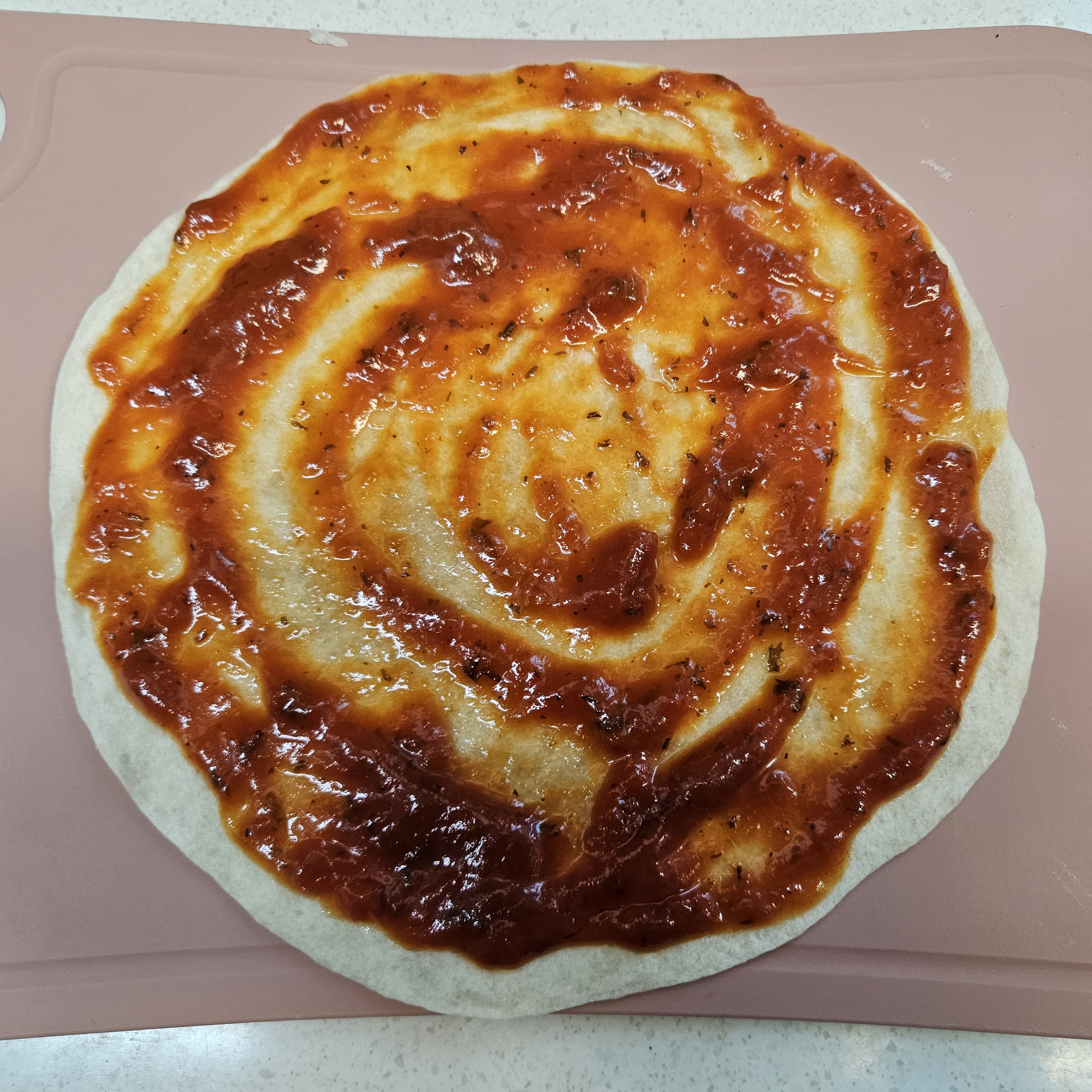 그 위에 토마토소스를 뿌려 펼쳐줍니다.